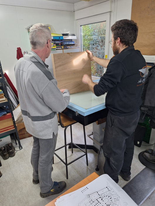 Réunion de chantier chez Alexandre GURY, à Saint-Aubin-des-Bois, avec Arnaud PAQUIN et Sébastien LEBOISNE.