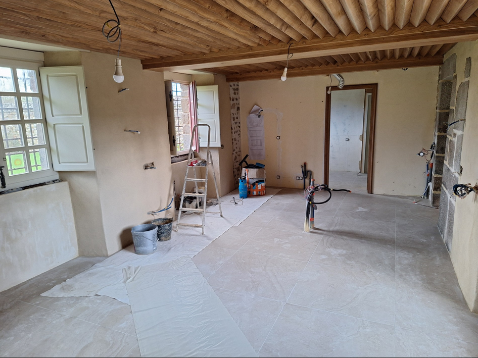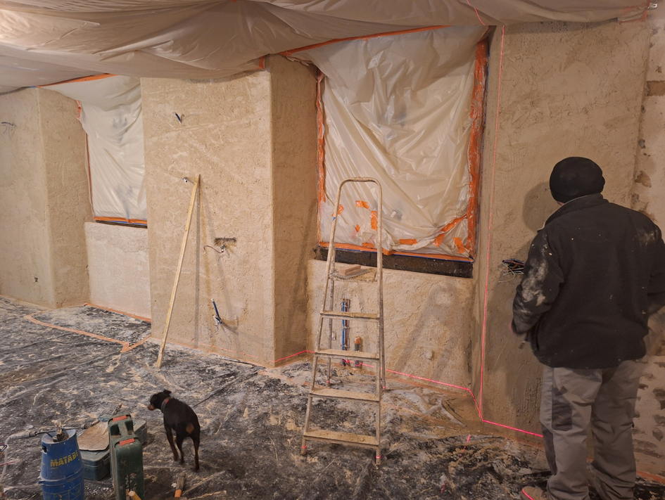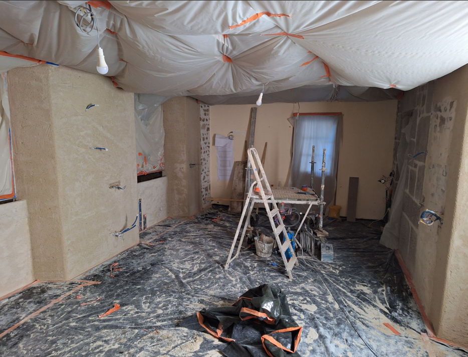 En fin de matinée, les maçons finissent de retirer les protections du plafond et des ouvertures :