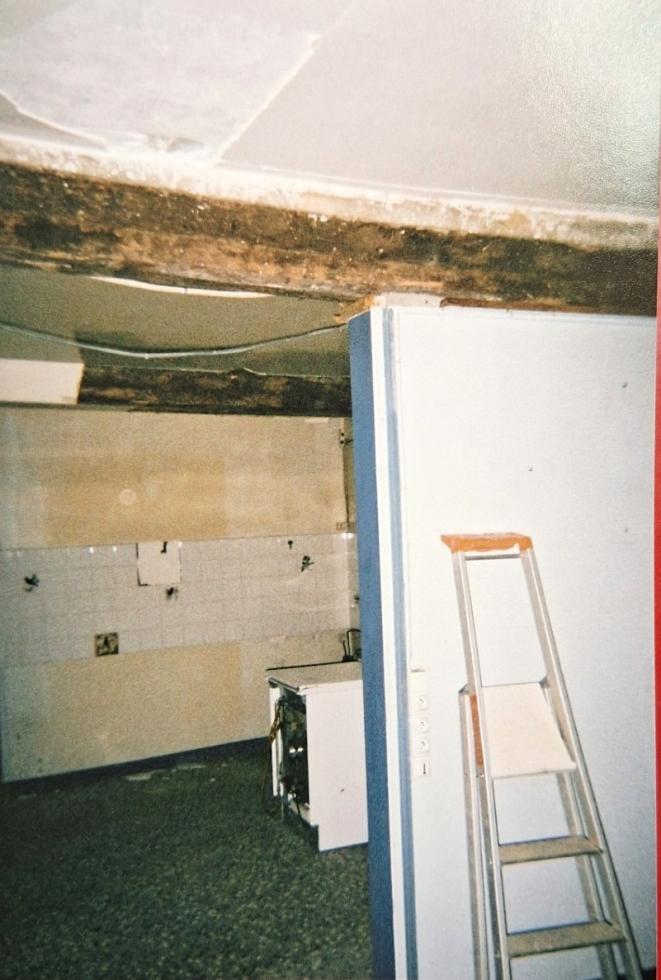 La seconde, un peu postérieure à la précédente, est prise, comme la première de ce message-ci, à peu près de l'endroit où je me tenais lors de la photo qui me représente ci-dessus, c'est-à-dire de ce qui était alors une seconde partie de la cuisine, séparée de la première, sur une moitié de la largeur de la pièce, par un mur d'autant plus étrange qu'il ne servait à rien si ce n'est à compartimenter l'espace en question de façon d'autant plus stupide qu'il y avait un évier de chaque côté :