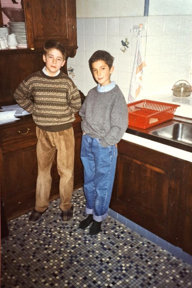 Sur la première, le cadet (à gauche) se tient à côté d'un de ses copains de l'époque. Le décor est celui en place en 1991, lors de notre achat. Il est typique de la prédilection de l'épouse du précédent propriétaire pour le bleu et pour les antiquailles plus ou moins frelatées :