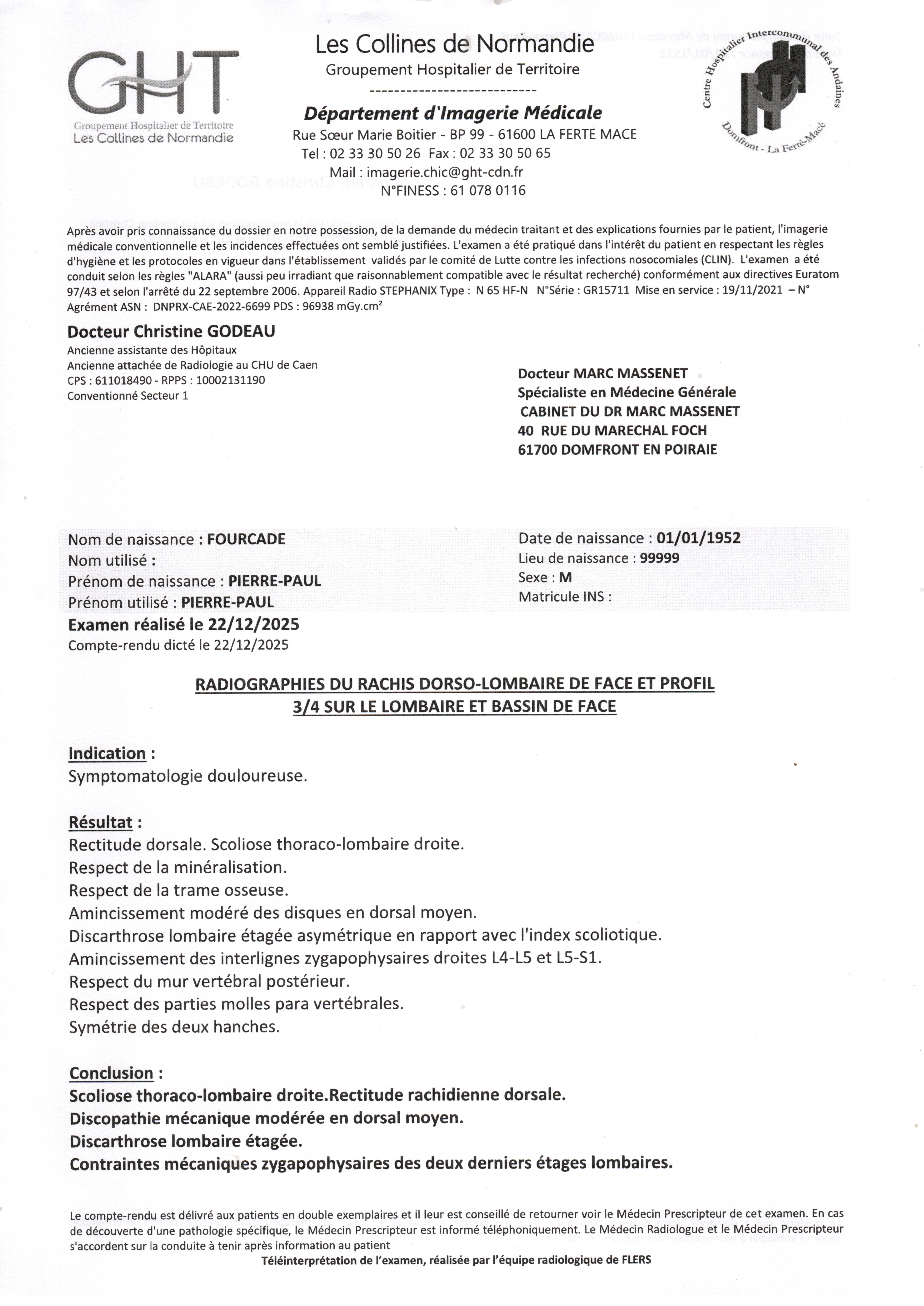 Voici la synthèse des examens radiologiques récents de ma colonne vertébrale :