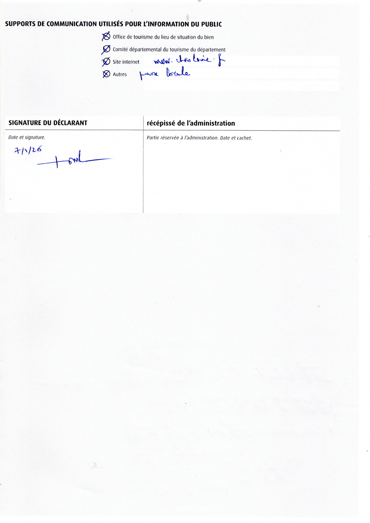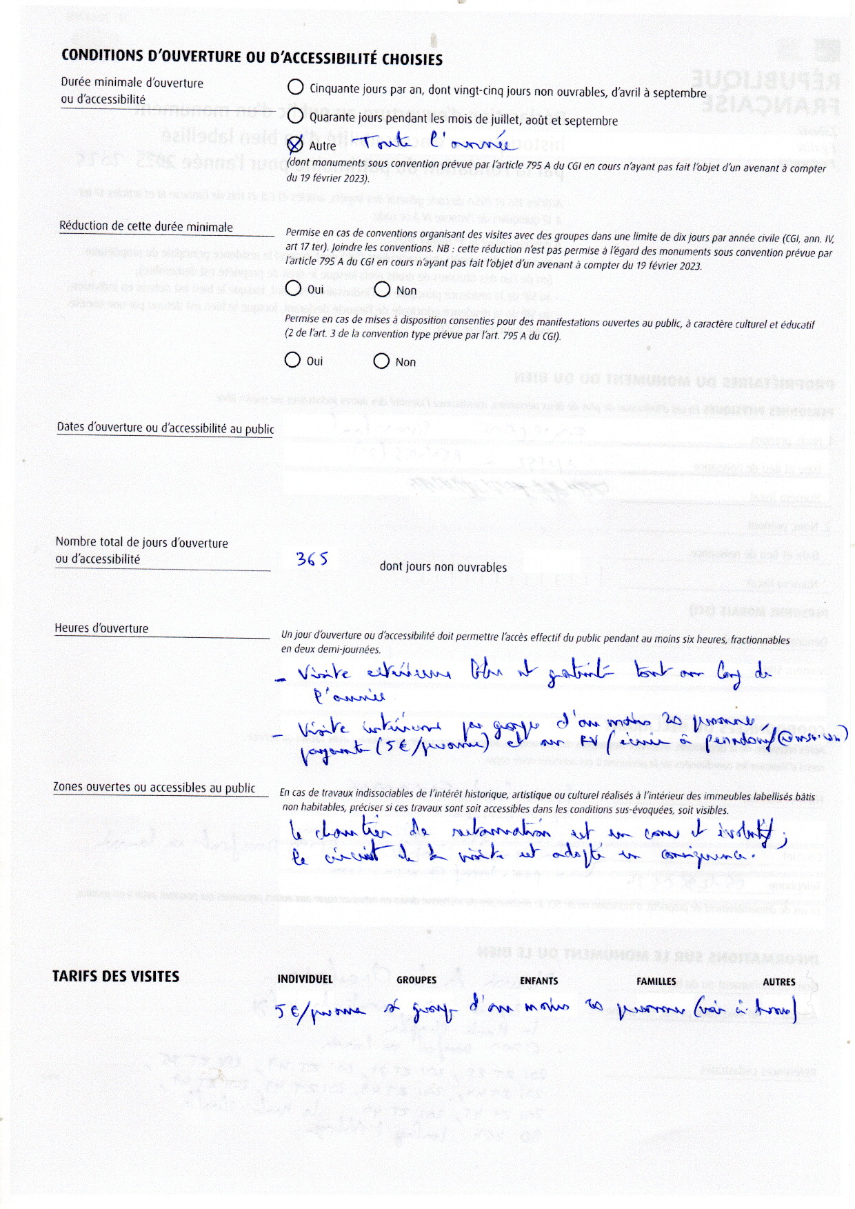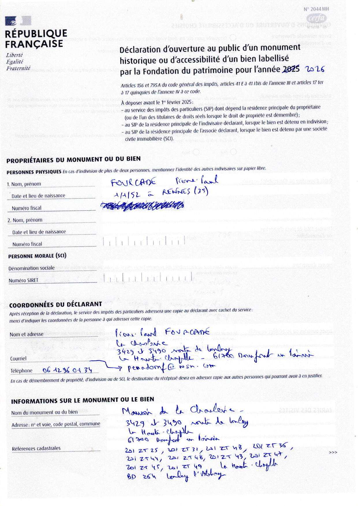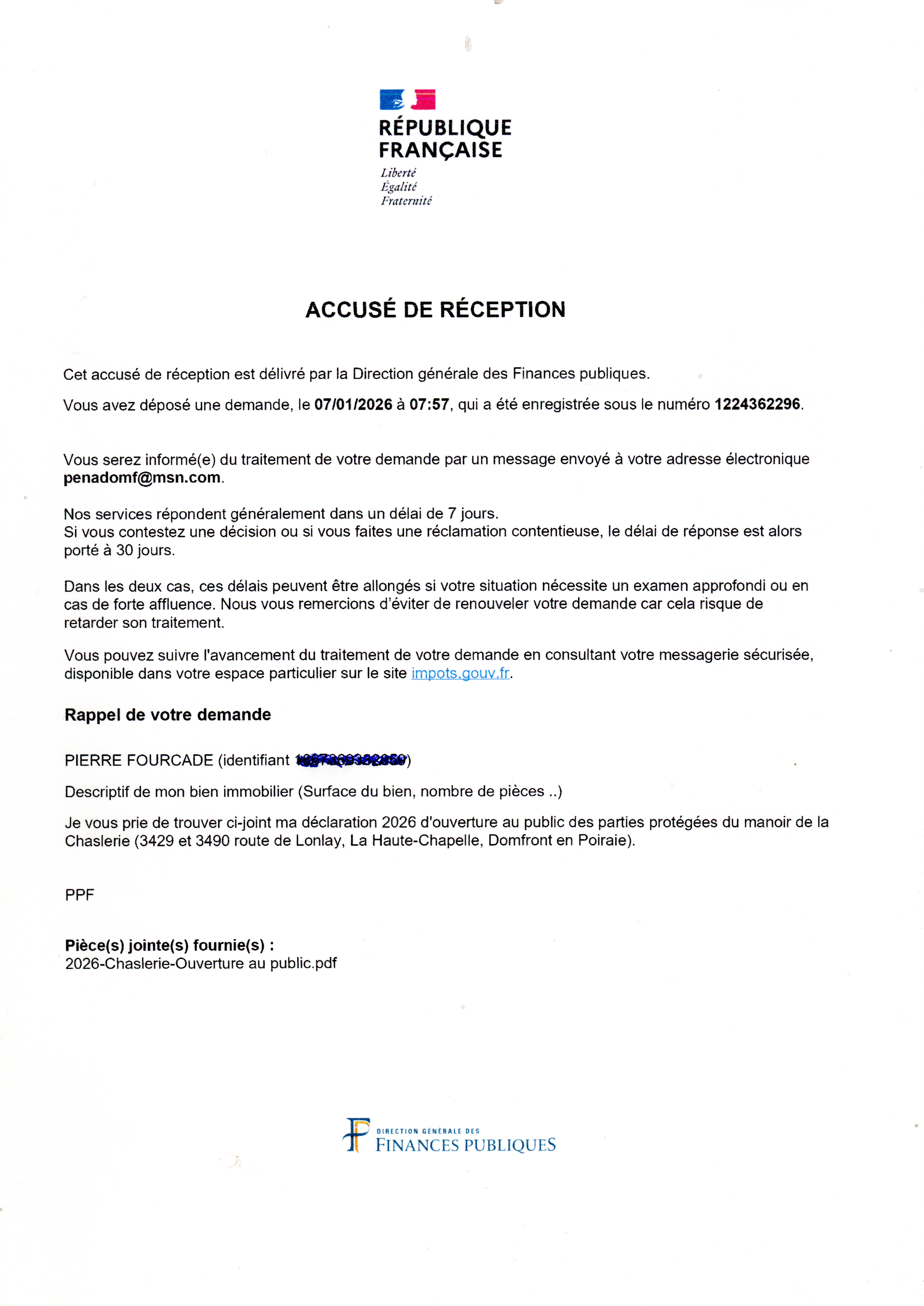 Je viens de transmettre au fisc ma déclaration d'ouverture au public de la Chaslerie en 2026 :