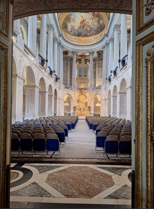 Aperçu sur la tribune royale de la chapelle du même métal où il m'est arrivé de trôner il y a plus de cinquante ans lorsque, jeune stagiaire de l'E.N.A., lors d'un concert aux côtés de Carole et au milieu d'illustres personnalités départementales (elles le sont toutes), je représentais la Gueuse :