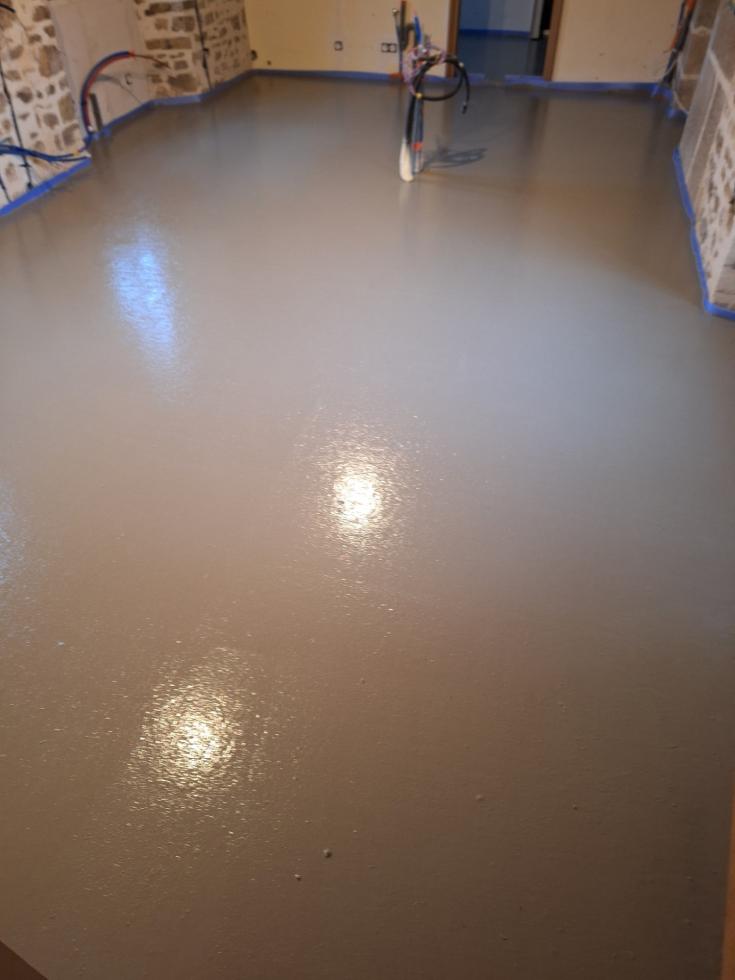 J'apprends que je pourrai marcher sur la chape dans 48 heures, qu'il faudra alors ouvrir un fenestrou pour l'évacuation de l'humidité et que Sébastien pourra revenir s'occuper du plafond d'ici quatre ou cinq jours, sans omettre d'appuyer alors son escabeau sur une planche pour en répartir la pression.
