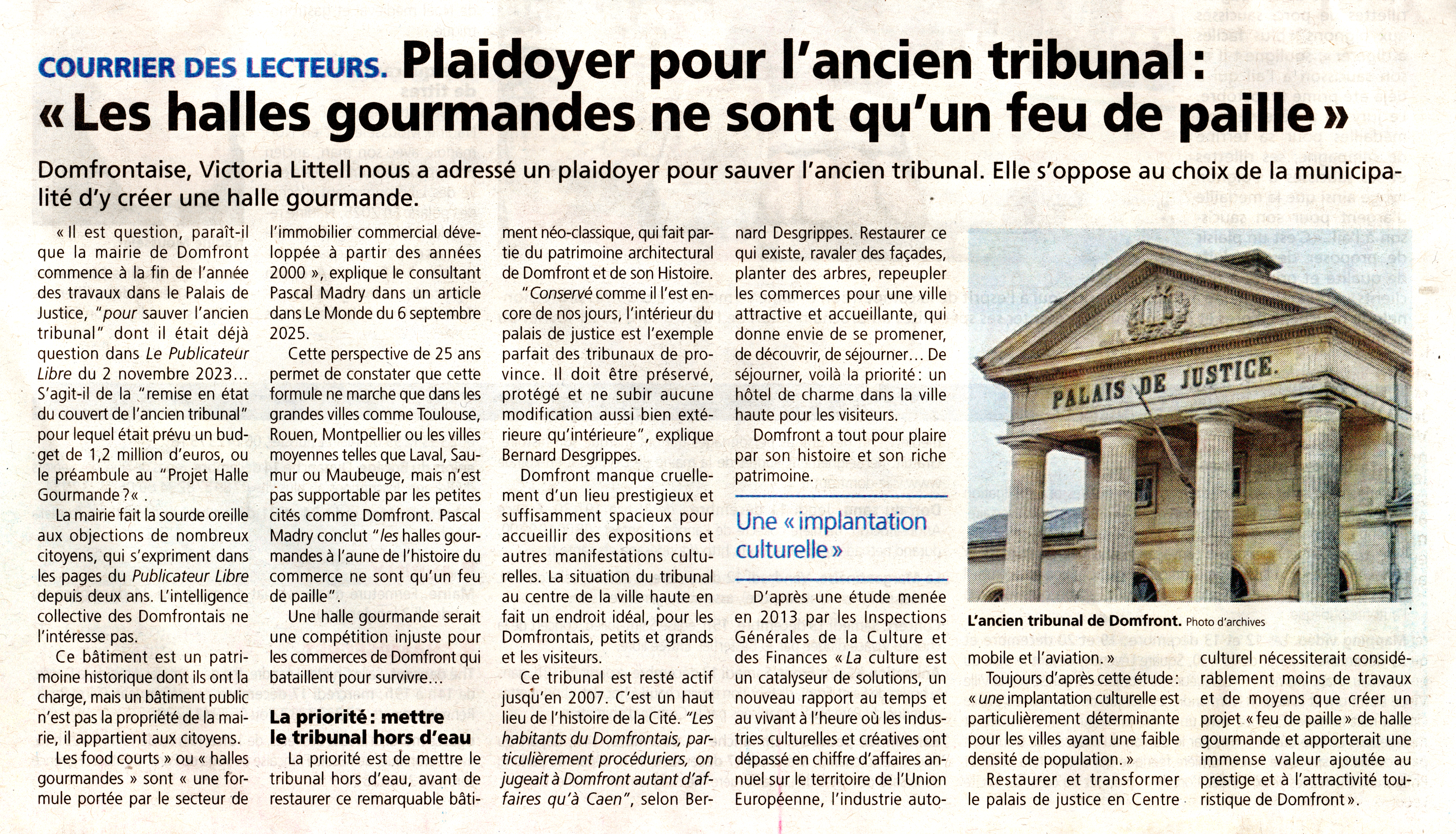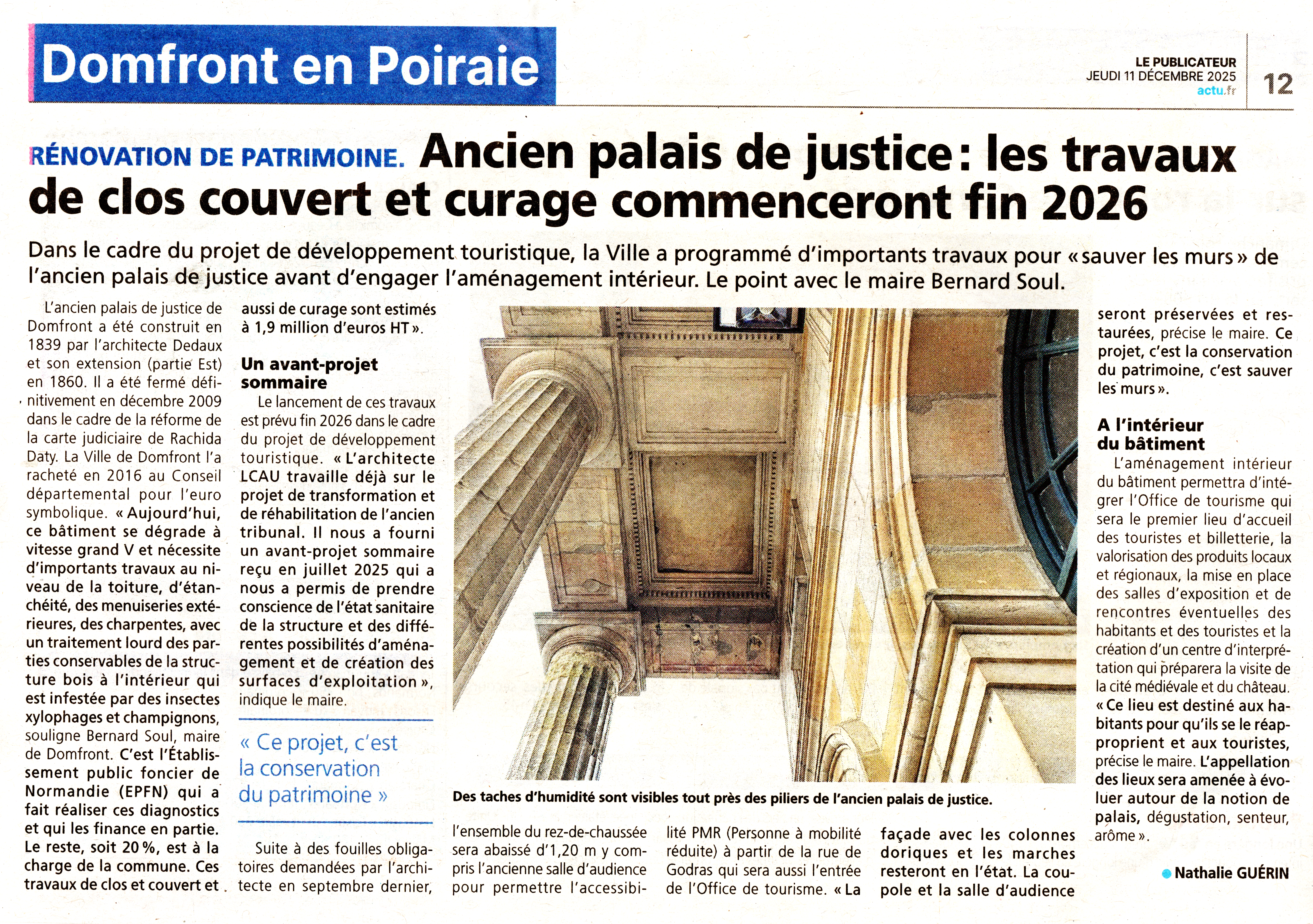 Dans "Le Publicateur Libre" du jour, deux articles sont consacrés à l'ancien palais de justice de Domfront :