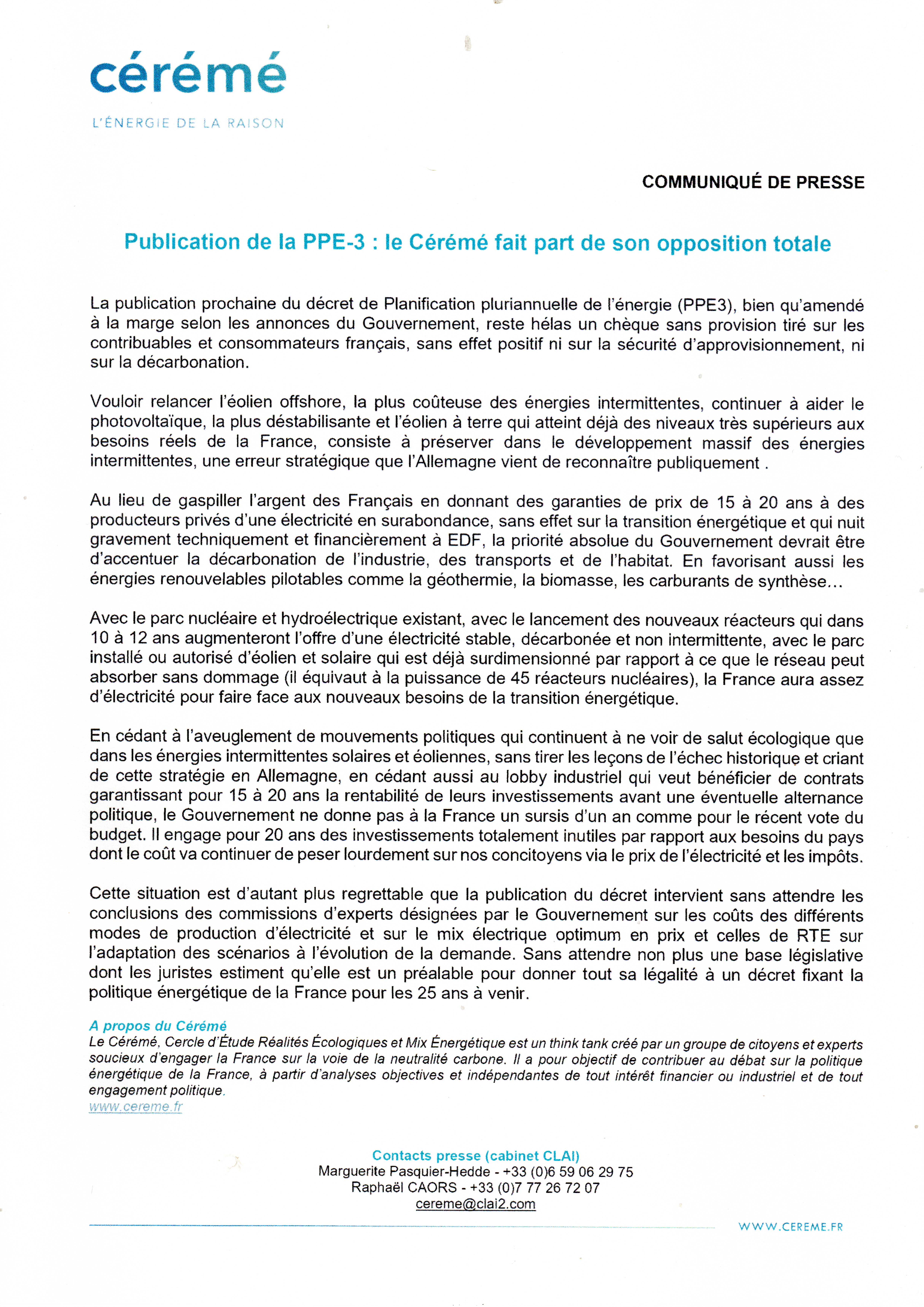 La Fédération Environnement Durable partage intégralement l’analyse du Cérémé : si la PPE-3 venait à être signée, la France serait engagée dans une impasse énergétique, industrielle et budgétaire.