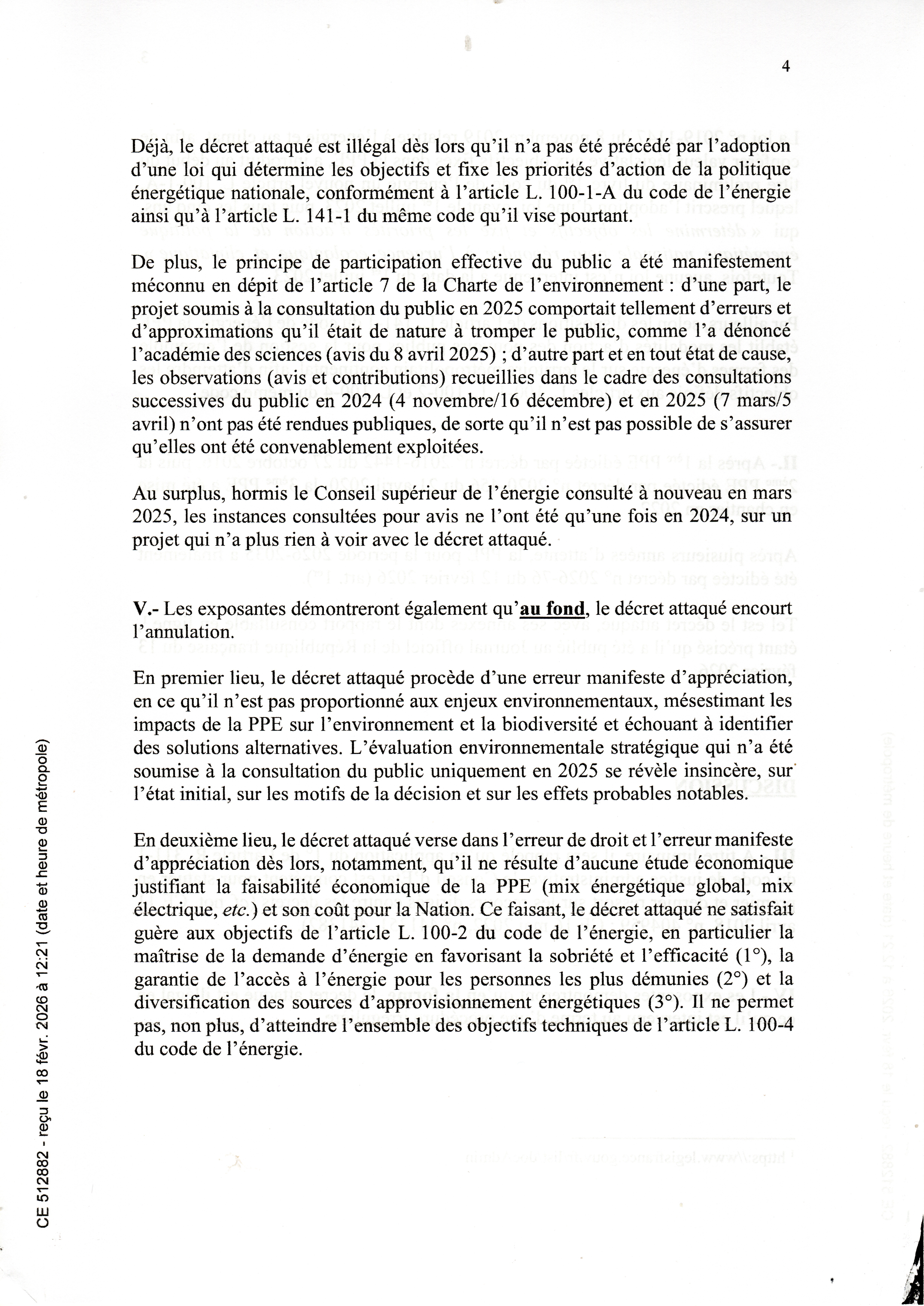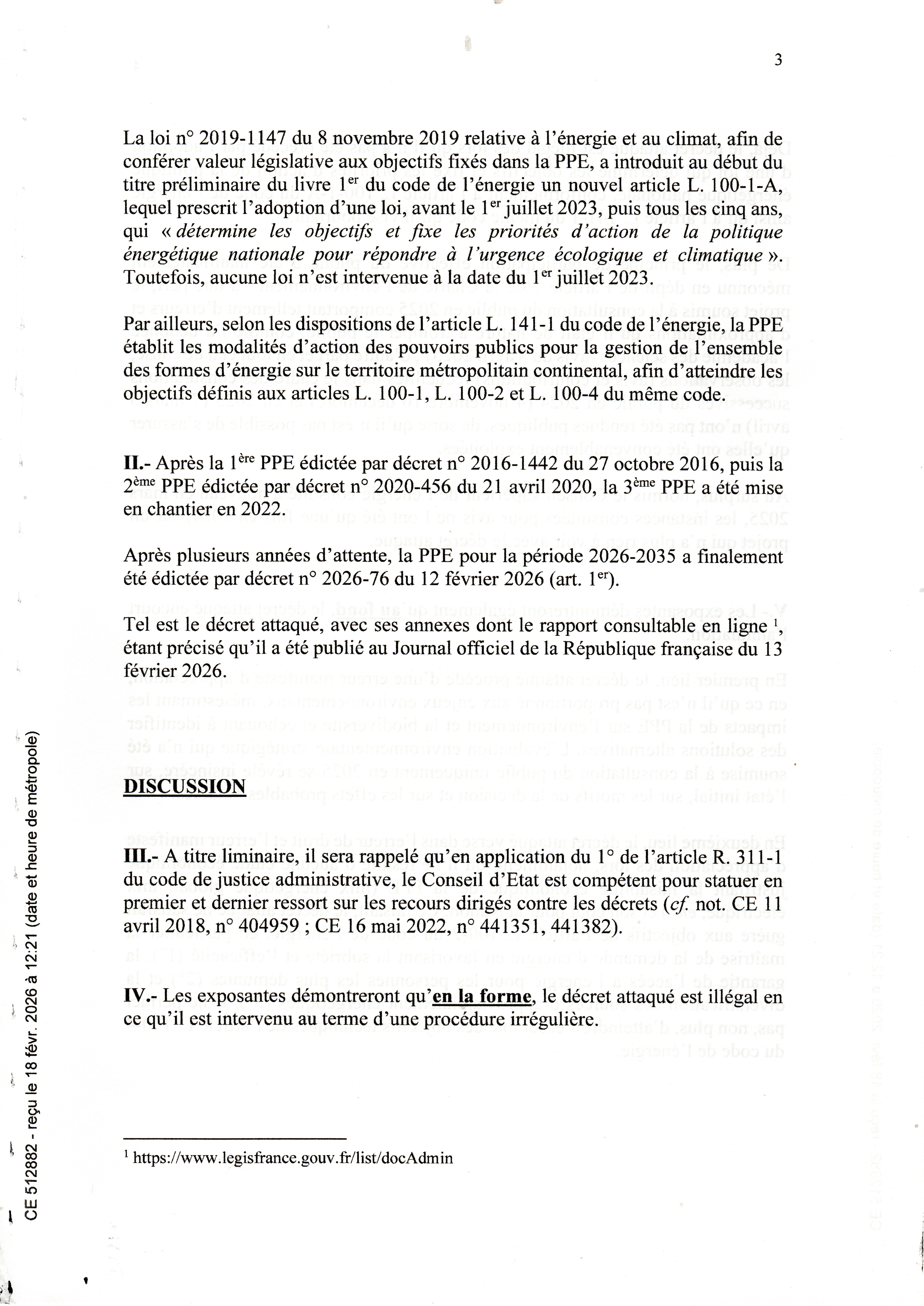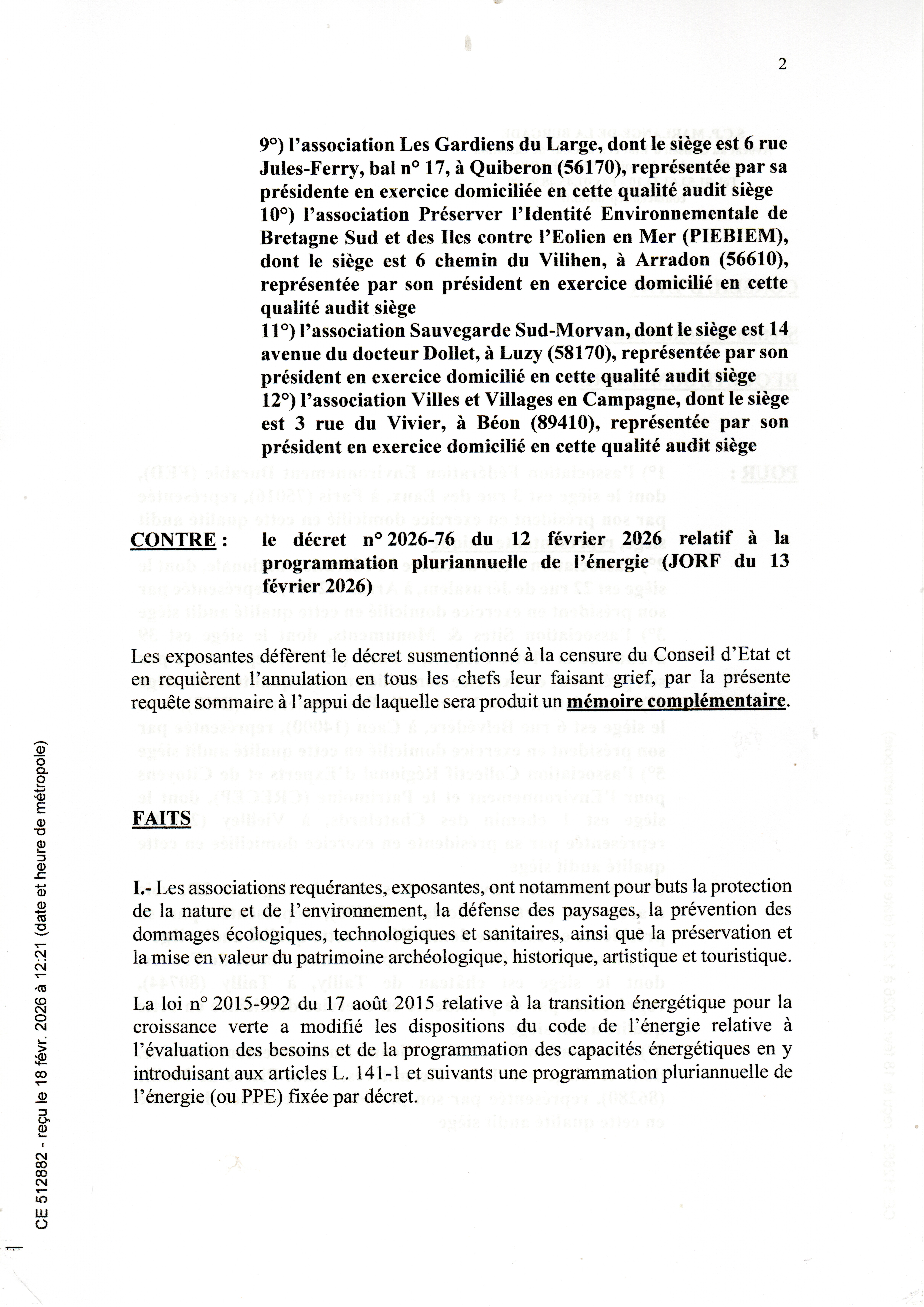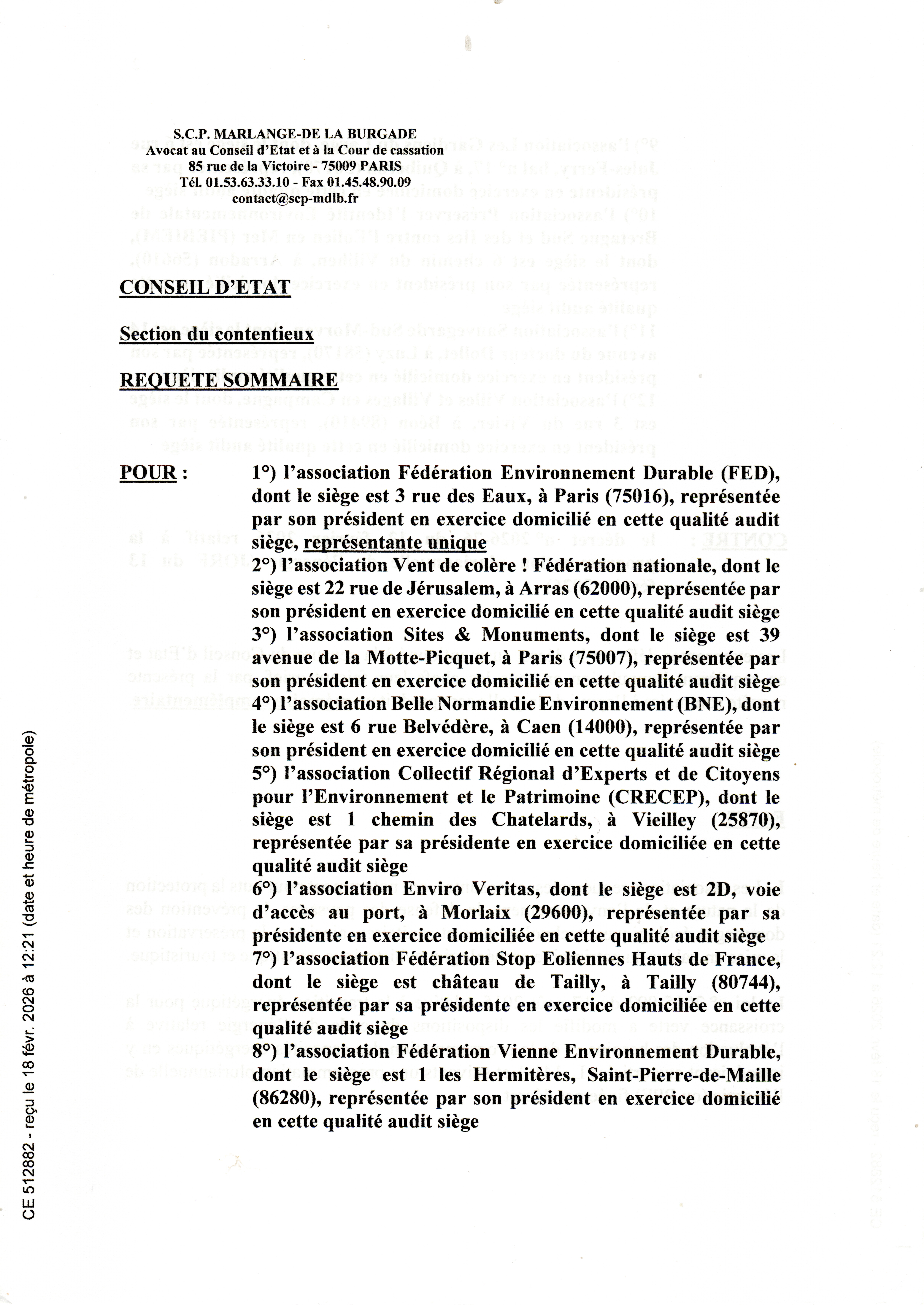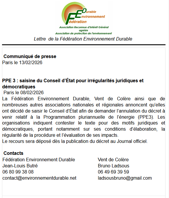Hervé TEXIER, président de "Belle Normandie Environnement" et vice-président de la "Fédération Environnement Durable", associations dont l'"A.D.D.O.O.E." est membre, me transmet ce matin le texte de la requête introductive d'instance déposée devant la section du contentieux du Conseil d'Etat pour faire annuler le décret entérinant la "PPE 3" :