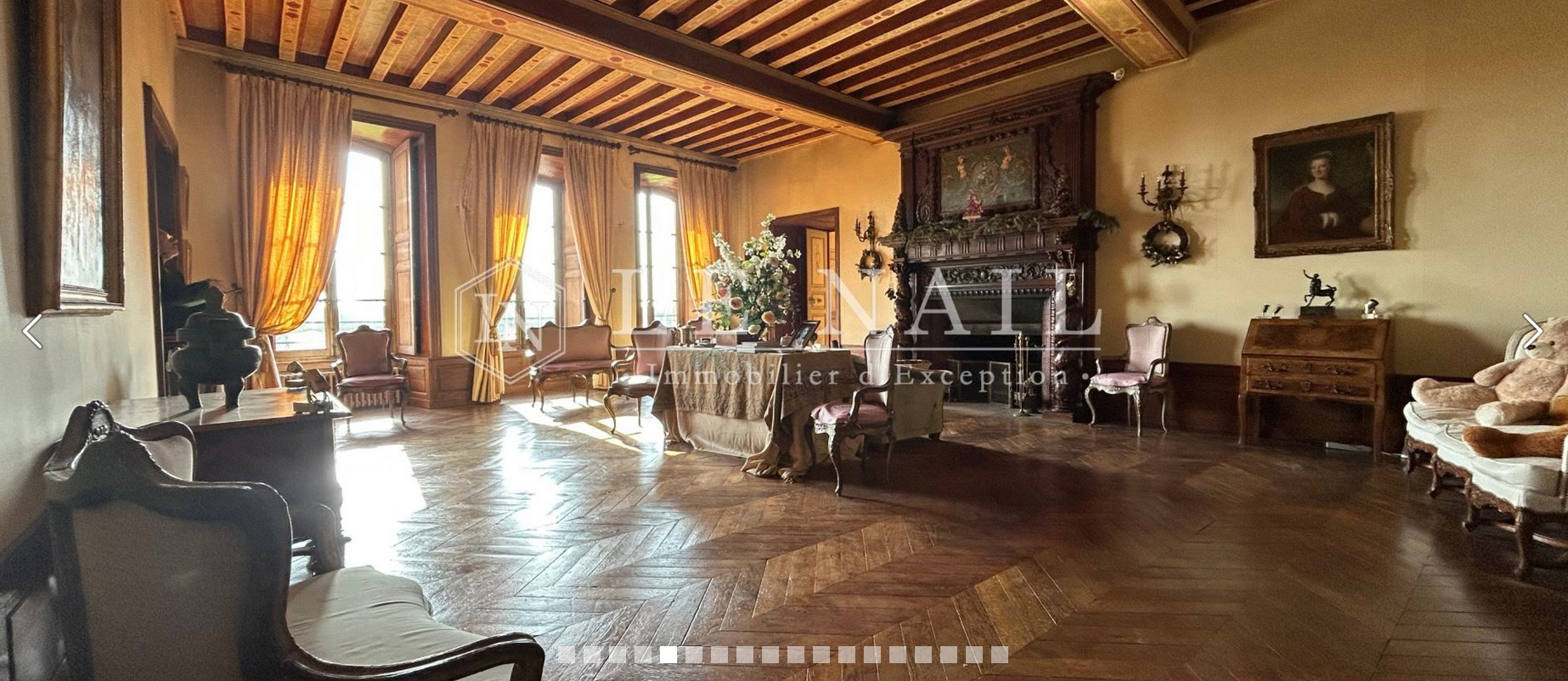 - Le grand salon de 66 m² avec trois fenêtres, une vue sur le jardin des bassins, un plafond à la française peint, une cheminée en bois très certainement du XVIIe et un parquet en pointe de Hongrie. La hauteur sous plafond est de 3,5 mètres.