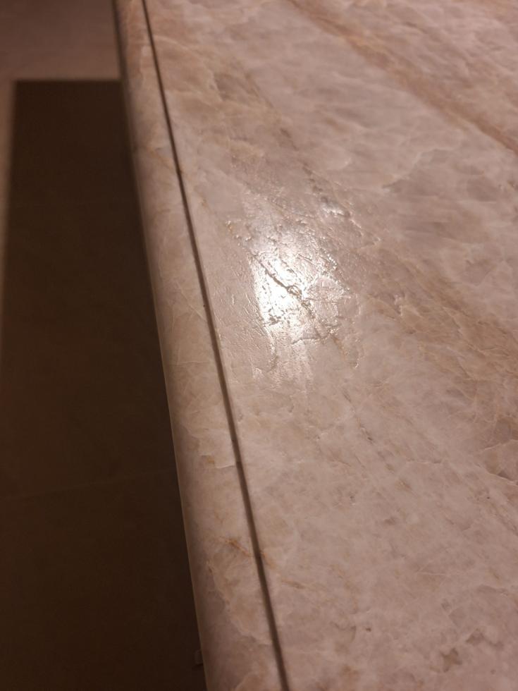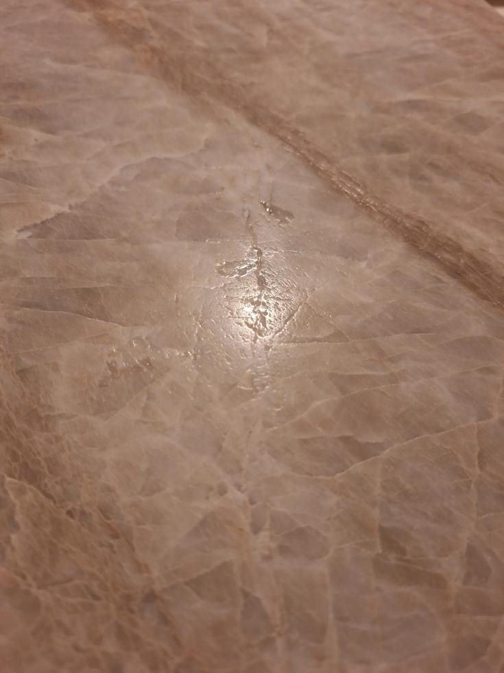 - la résine utilisée pour colmater les défauts de surface du quartzite n'ayant pu résister à la vigueur de la brosse nécessaire pour la finition"satinée", des défauts très disgracieux de ladite pierre sont ressortis. Je note d'ailleurs qu'un tel traitement n'est pas conseillé pour le quartzite et ne suis pas informé des raisons qui ont conduit à l'appliquer cette fois-ci, d'autant que les échantillons qui nous avaient été transmis au moment de la commande étaient soit polis, soit adoucis mais certainement pas satinés ;
