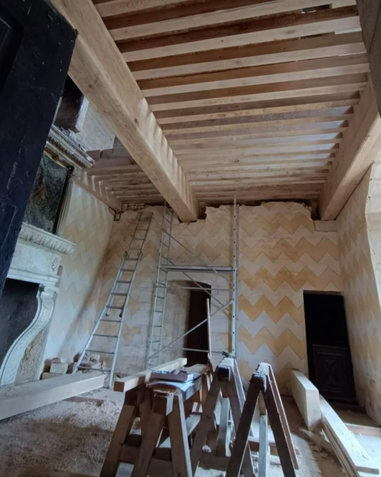 Conversation téléphonique ce matin avec Arnaud PAQUIN à propos des peintures des plafonds et des murs de la salle-à-manger du logis et de la pièce attenante de la tour nord-est.