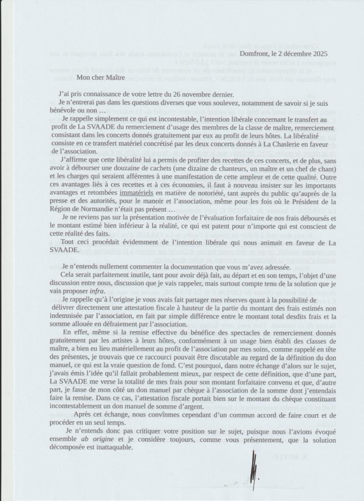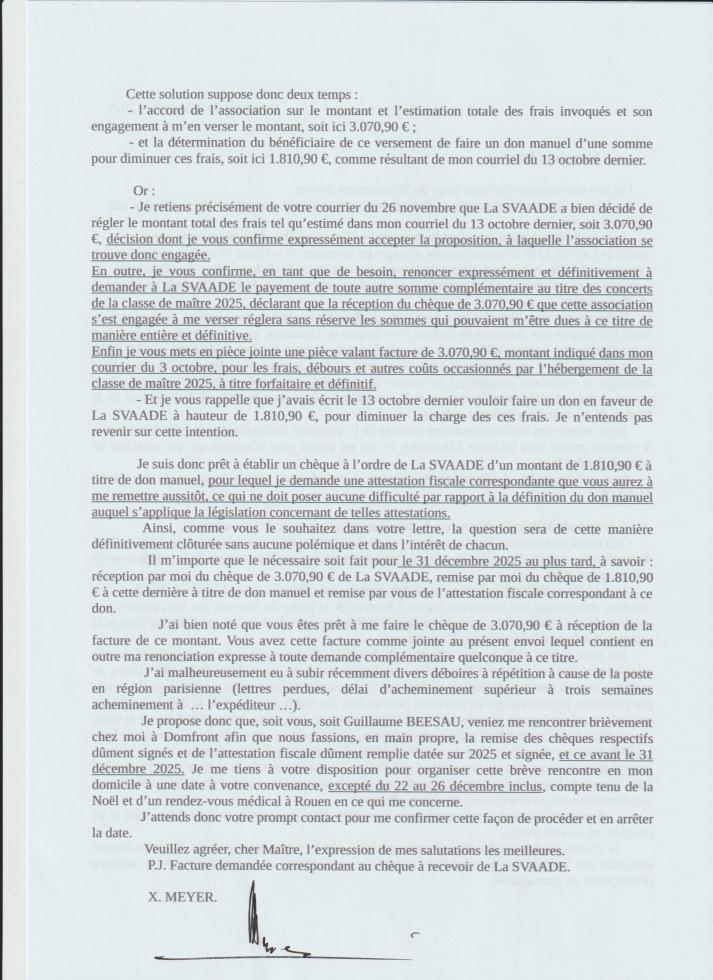 Malgré ma démission du 6 janvier 2025 et mon retrait comme membre de l'association, mon épouse et moi-même, avons voulu, pour la dernière fois cette année, dans le même esprit et les mêmes proportions que précédemment, faire bénéficier partiellement La SVAADE de ces concerts qui nous revenaient en remerciements des membres de la classe de maître accueillis par nous.
