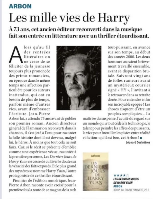 « Certains patronymes sont porteurs d’imaginaire. Celui d’arbon, sans majuscule, en couverture du roman dont il est ici question, en est un exemple. Je ne suis féru ni de science-fiction ni d’anticipation […] mais ces deux syllabes m’évoquent aussitôt une planète où régnerait un seigneur des galaxies. Sur le plancher des vaches, Arbon – avec une majuscule cette fois – se prénomme Jean-Pierre. Son CV est un slalom géant. Diplômé d’HEC, il est d’abord dans l’industrie pharmaceutique. Puis, successivement, directeur général de Flammarion, pionnier de l’édition en ligne, auteur-compositeur-interprète, dramaturge… Aujourd’hui, belle gueule d’aventurier reproduite à l’intérieur de l’ouvrage, le voilà qui renaît, à 71 ans, en écrivain débutant, avec un roman dont le sujet ne fera pas mentir l’attaque de cet article.