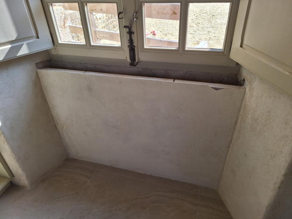 Pis : alors qu'il devait raboter le haut du dispositif en siporex sous la fenêtre sur cour, il a employé un outil à percussion, a ébranlé le siporex au point d'en décoller les morceaux les uns des autres et de décoller également l'enduit de chaux du montage précédent. Il a de plus embouti cet enduit.