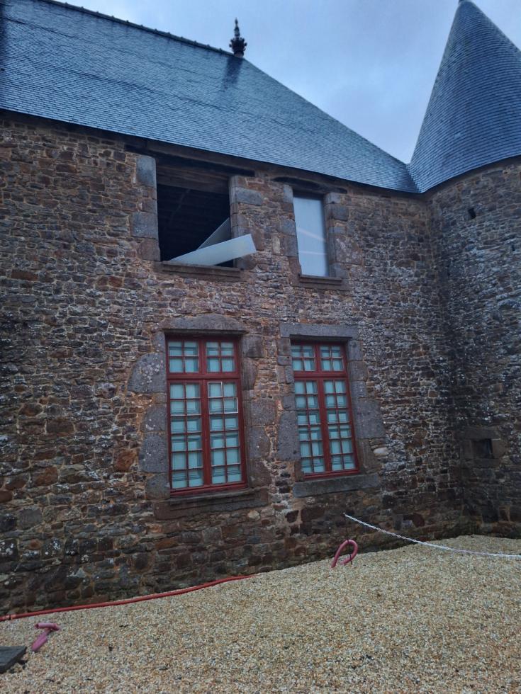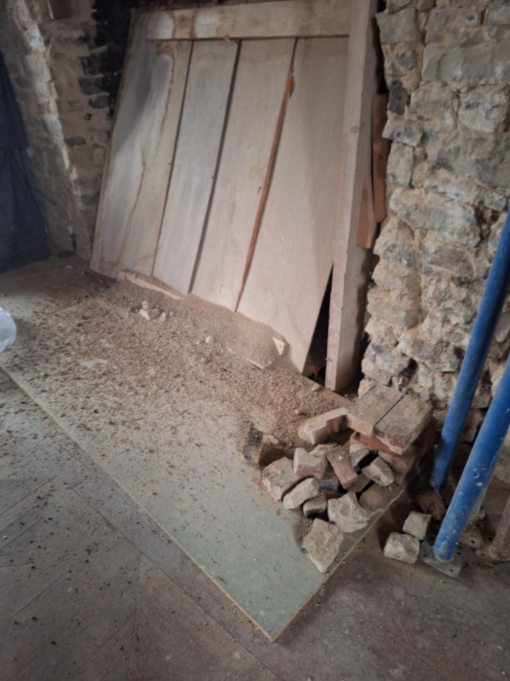 Dans l'ancienne chambre de l'étage, la tempête a fait chuter de nombreuses pierres et briques du conduit de cheminée :