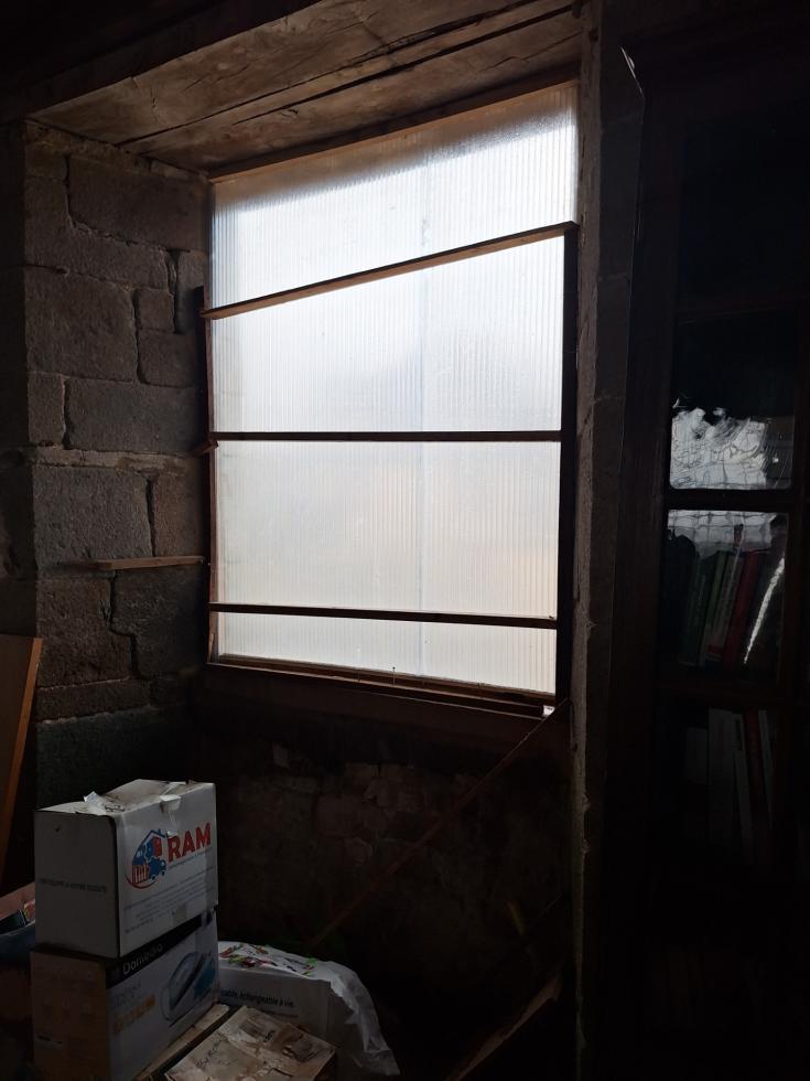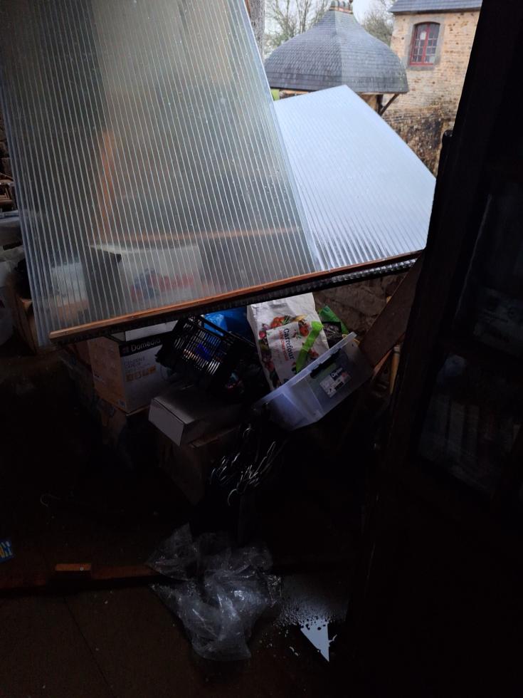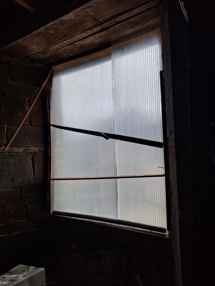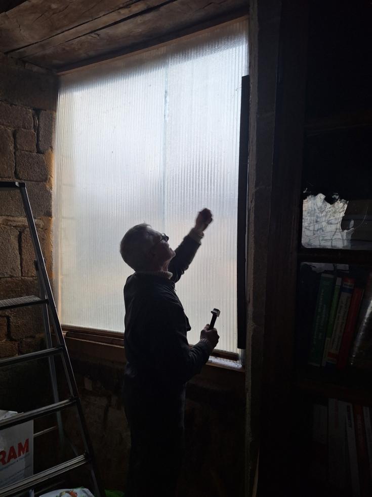 Avec Arnaud BEAUDET, nous refixons sommairement les occultations envolées. Au moins, cela arrêtera l'entrée de la pluie et calmera un volatile qui a trouvé refuge dans le salon où il est susceptible de chier partout :
