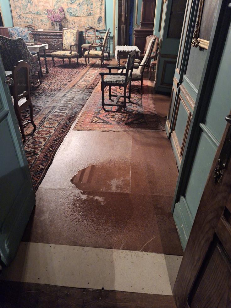 Remonté à l'étage, je vois que l'eau a réussi à parcourir les deux tiers de la largeur du bâtiment. Il faudra prendre le temps de constater les dégâts parmi les meubles conservés à cet étage :