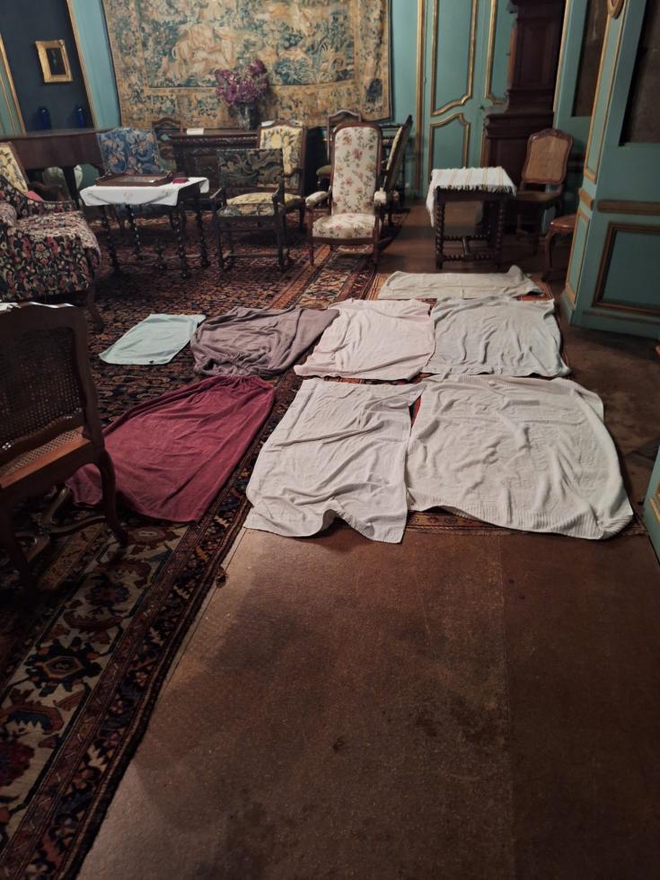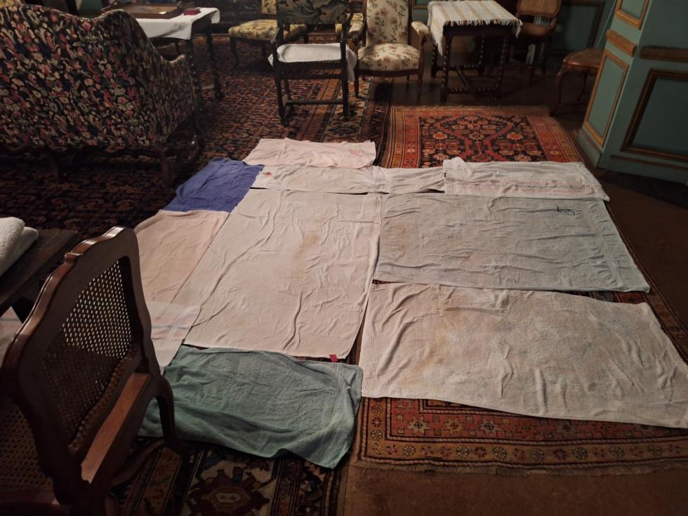 Pour éponger les tapis et un siège d'époque qui a morflé, j'utilise une bonne quinzaine de serviettes de bains ou de toilettes :