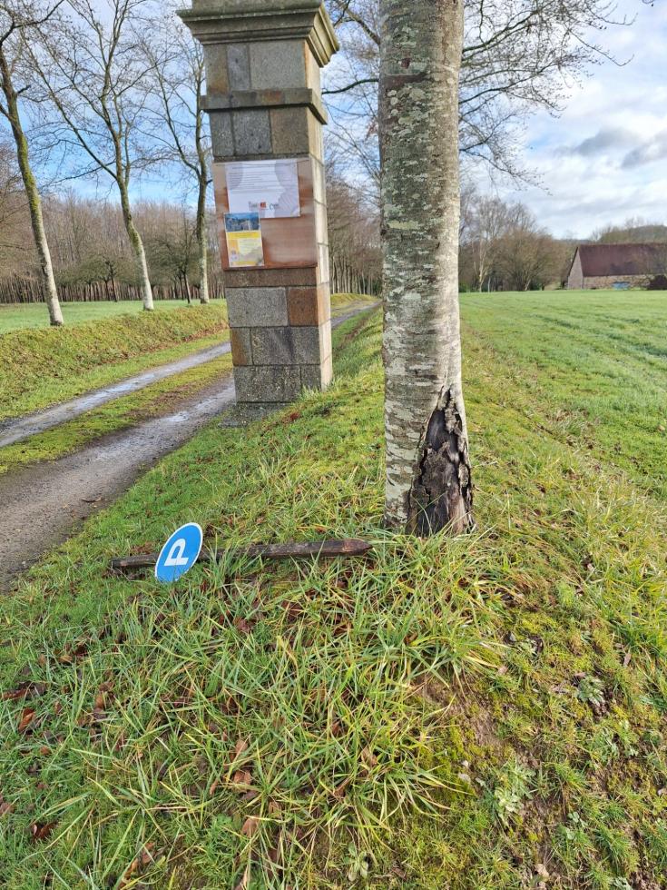 Enfin, à côté des pilastres, le panneau indiquant le parking des visiteurs a été arraché, dévoilant une grave blessure du hêtre auquel il était adossé :