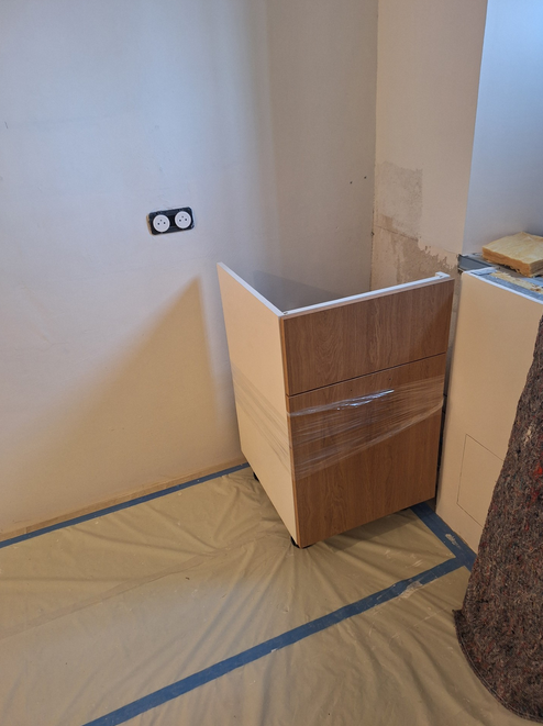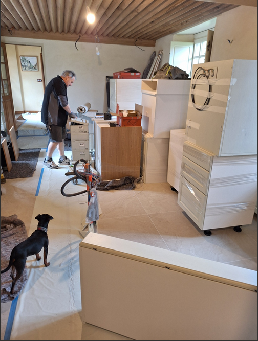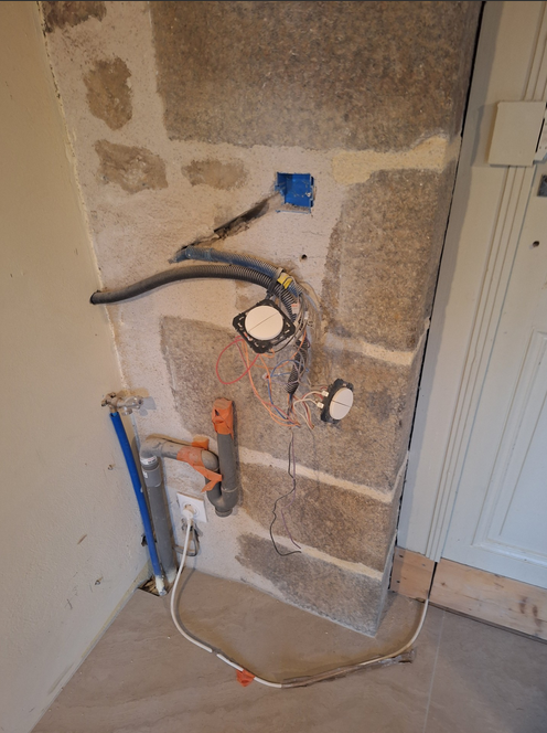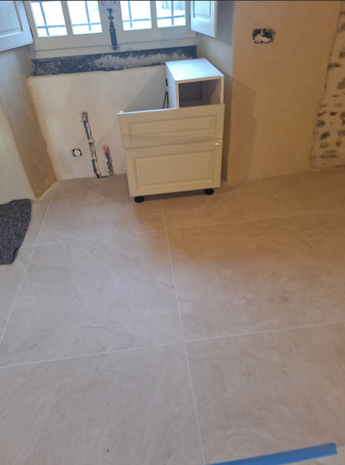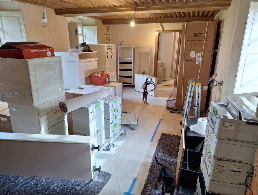 P.S. 2 (à 10 heures 45) : Problèmes réglés. L'électricien passera demain matin, j'en remercie M. ROBVEILLE. L'intervention était urgente car, paraît-il, la pose devait commencer par le fond de la cuisine.